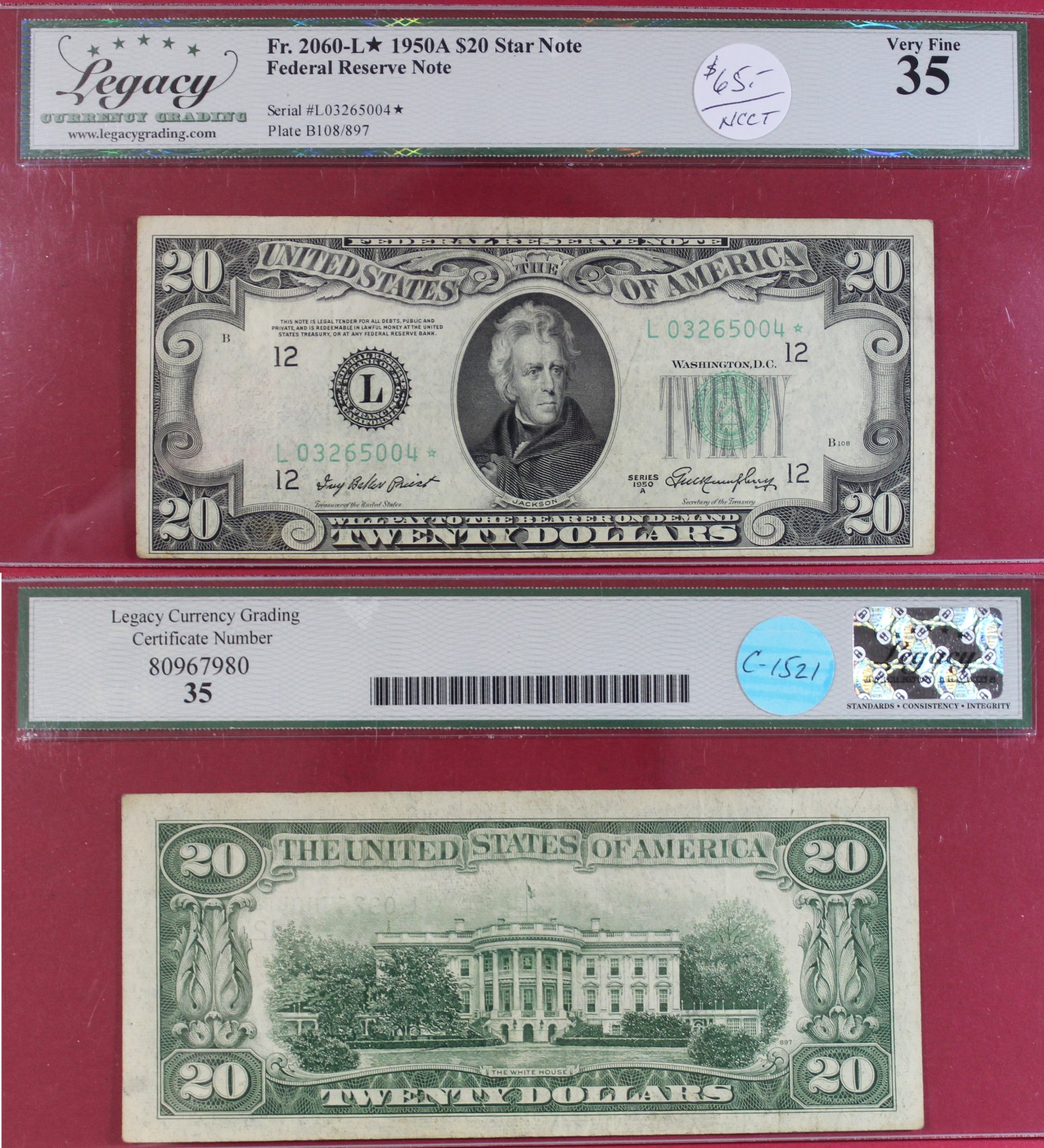 SMALL | $20.00 | FED. RES. | 1950-A | FR-2060L* | VF-35 | $65.00 |