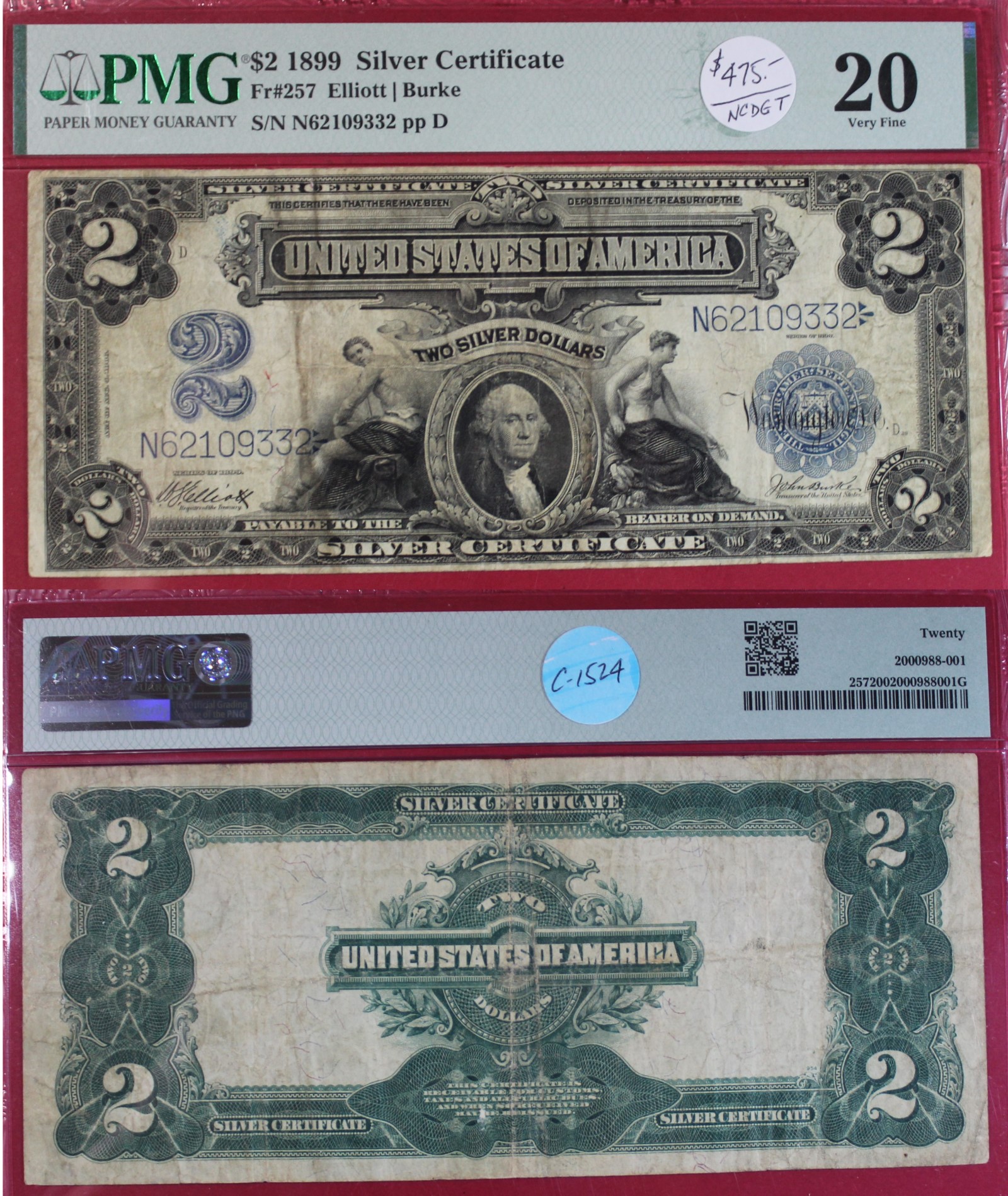 LARGE | $2.00 | SILVER CERT. | 1899 | FR-257 | VF-20 PMG | $475.00 |