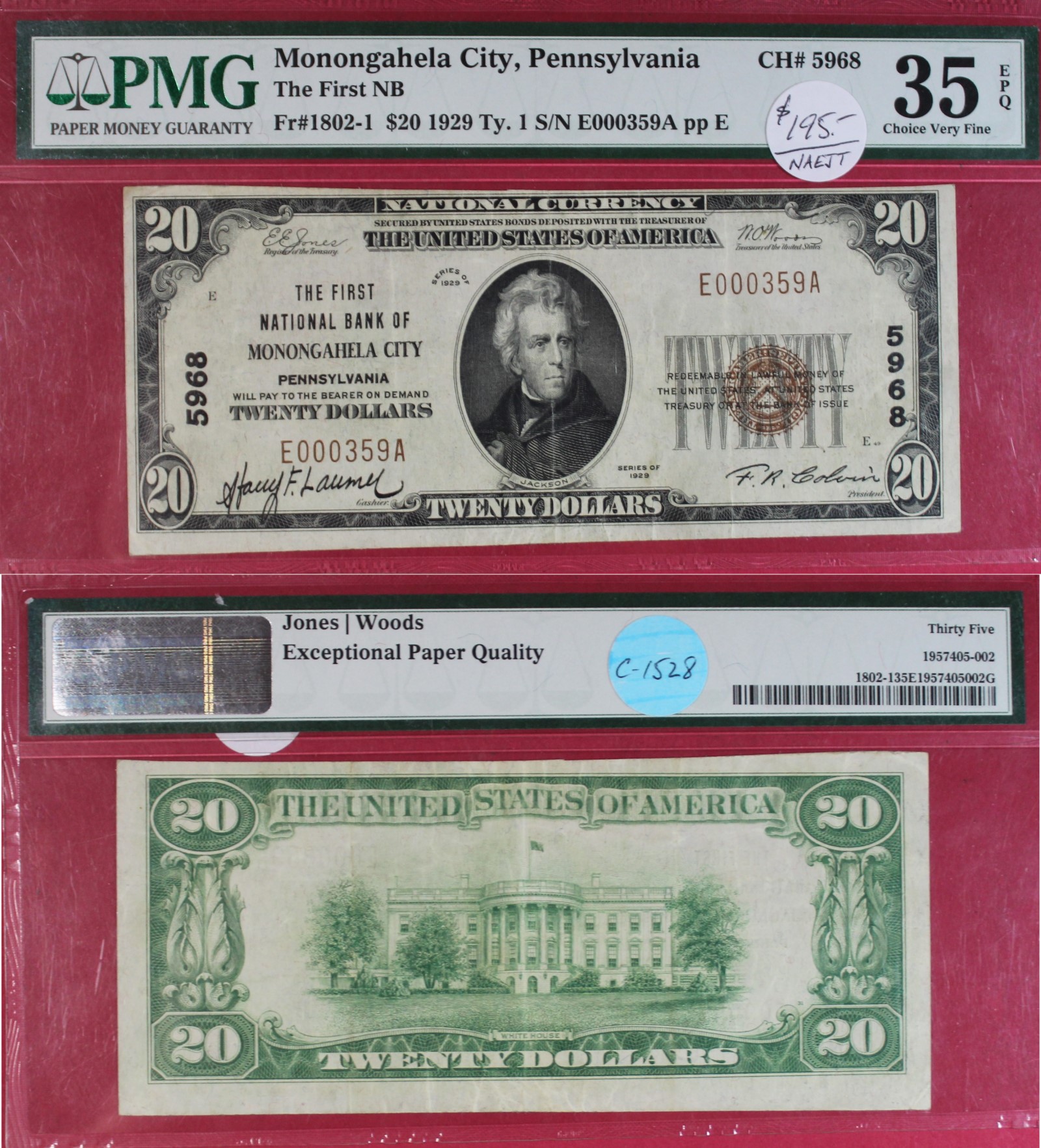 SMALL | $20.00 | NAT'L CUR. | 1929 | MONONGAHELA, PA #5968 | VF-35 EPQ PMG | $195.00 |