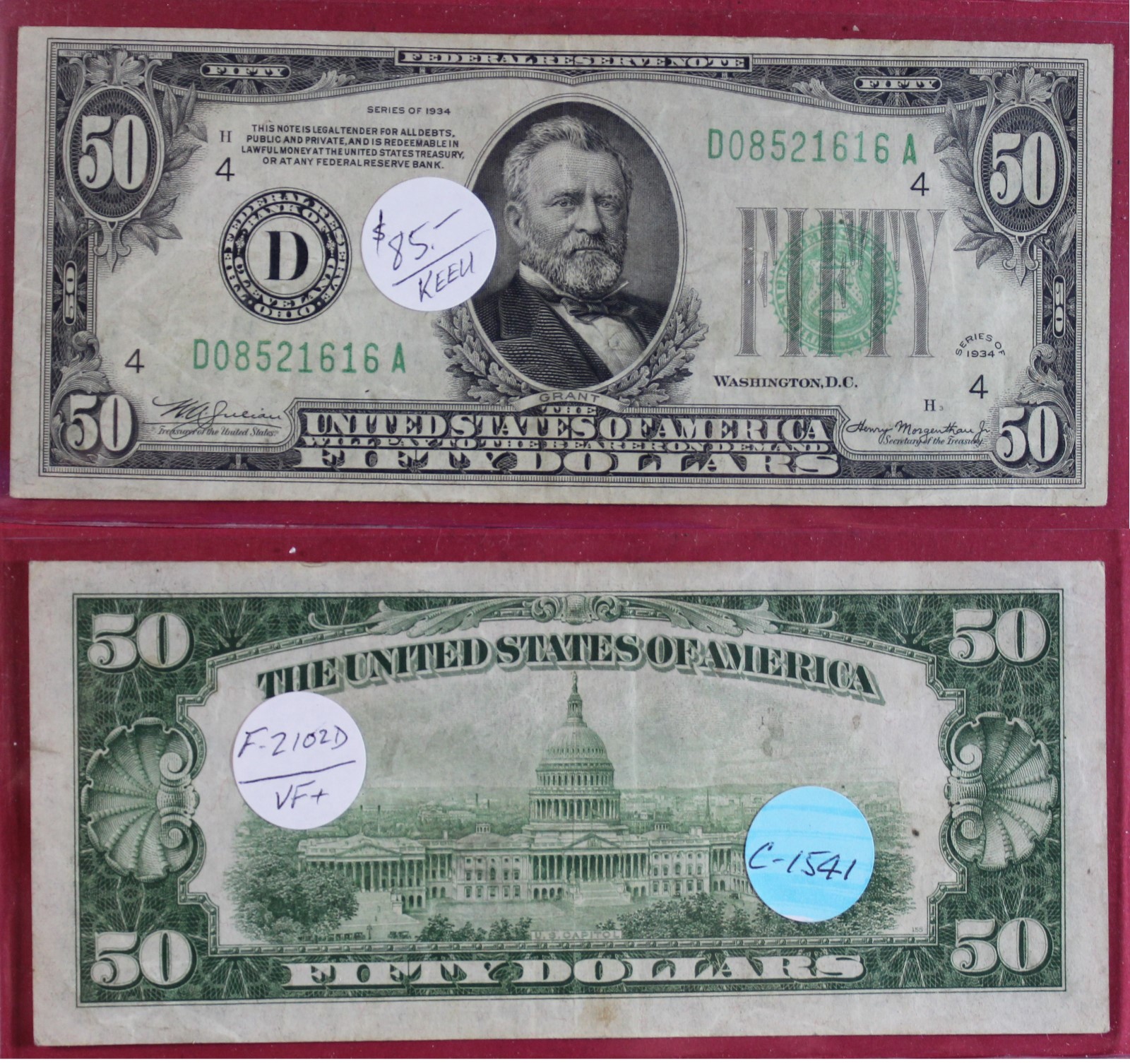 SMALL | $50.00 | FED. RES. | 1934 | FR-2102D | VF-35 | $85.00 |