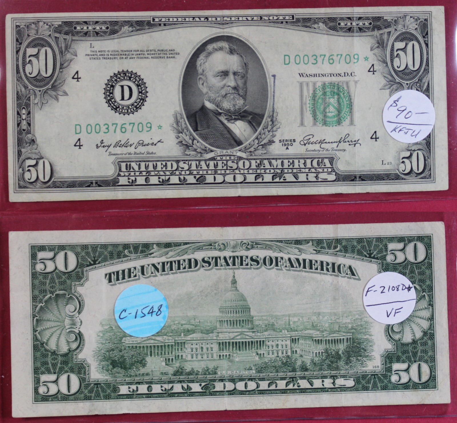 SMALL | $50.00 | FED. RES. | 1950-A | FR-2108D* | VF-20 | $90.00 |