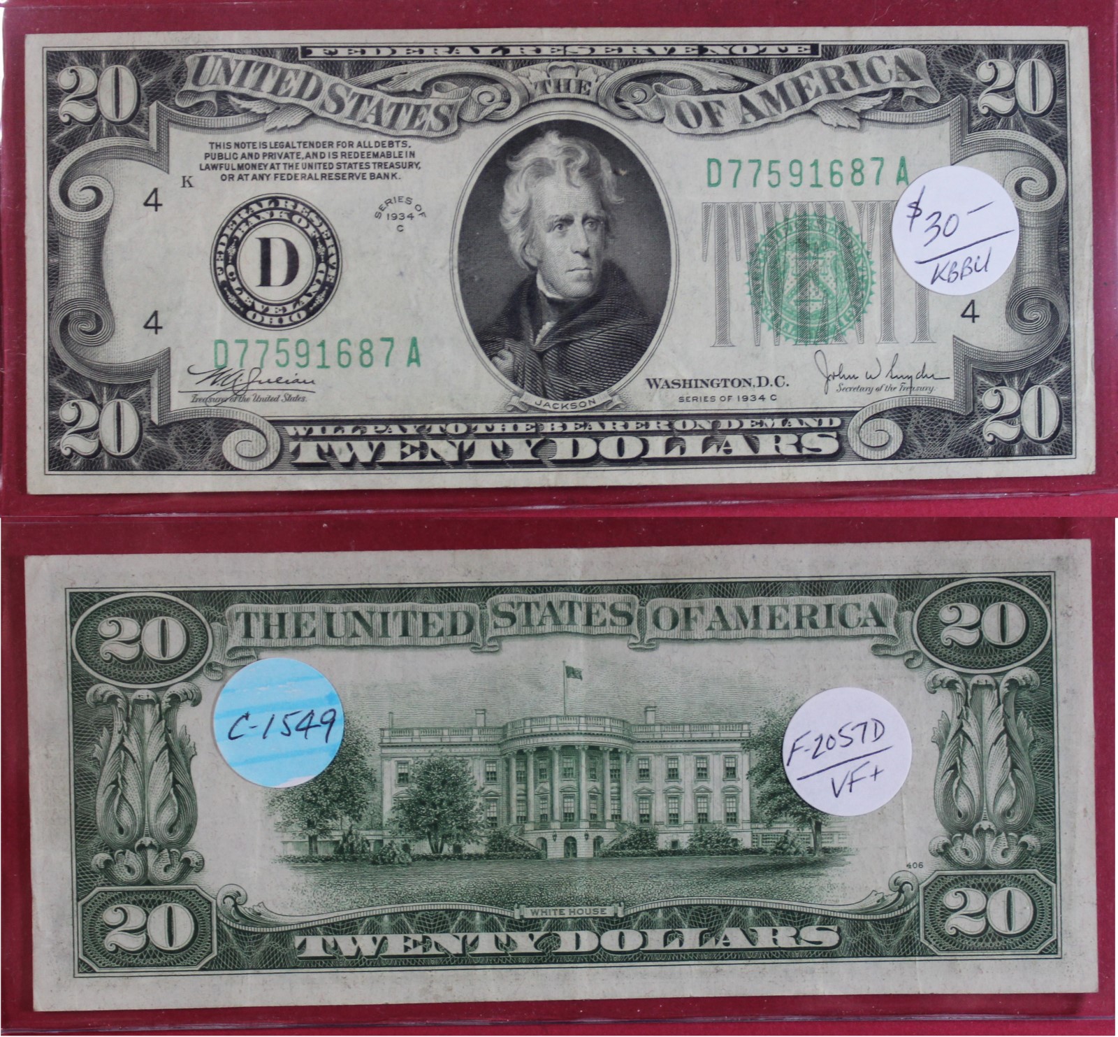SMALL | $20.00 | FED. RES. | 1934-C | FR-2057D | VF-35 | $30.00 |
