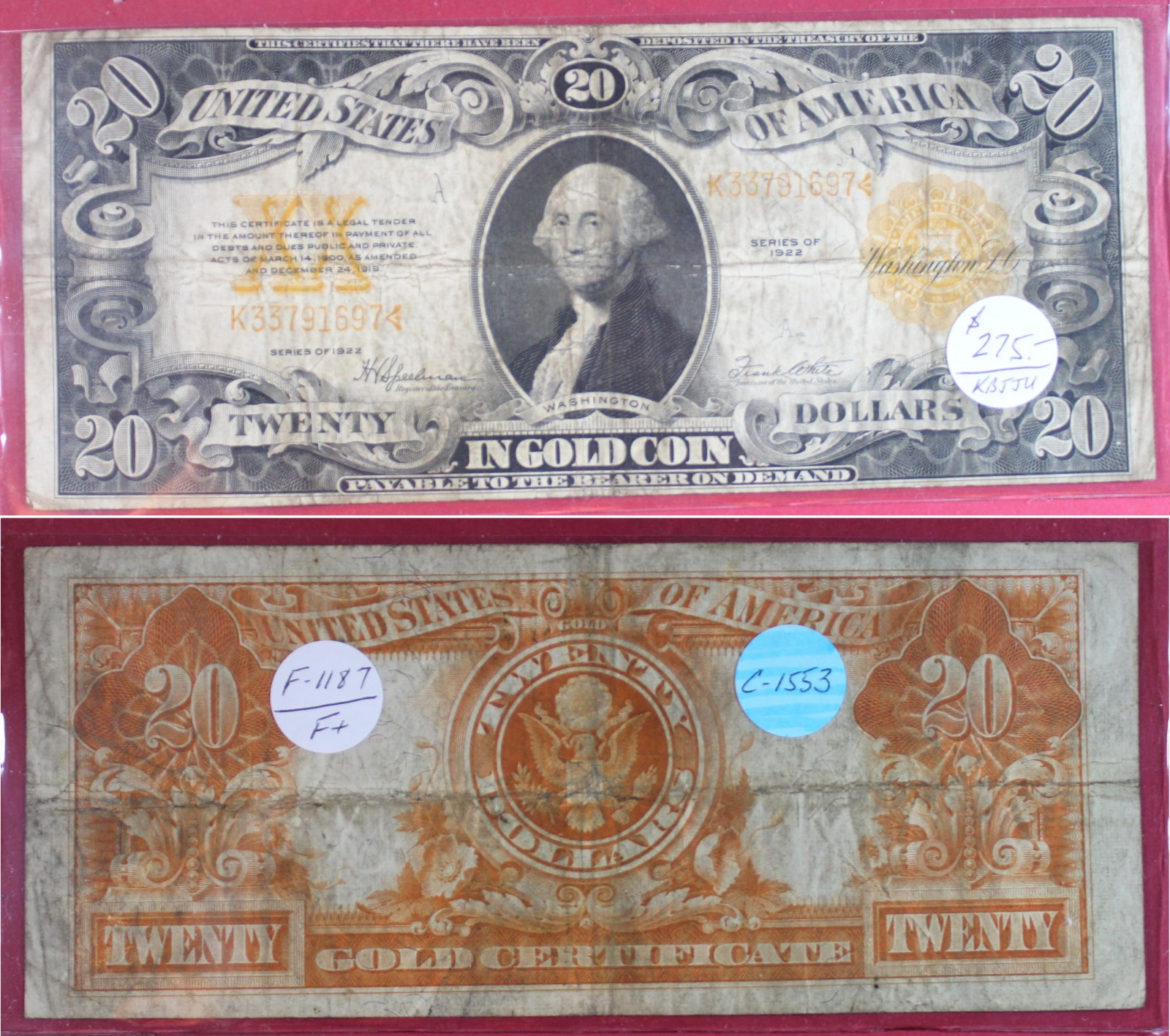 LARGE | $20.00 | GOLD CERT. | 1922 | FR-1187 | F-15 | $275.00 |