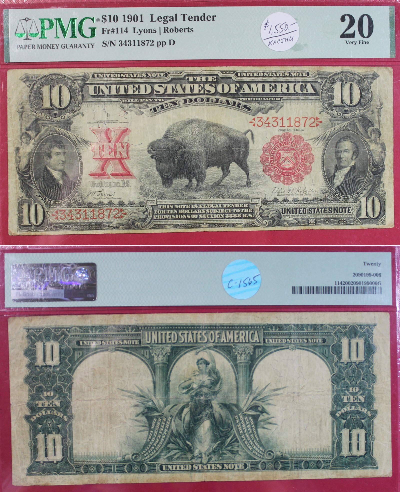 LARGE | $10.00 | LEGAL TNDR | 1901 | FR-114 BISON | VF-20 PMG | $1550.00 |